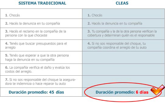 Cuando chocan dos vehículos asegurados en las compañías adheridas al sistema, entra en funcionamiento el CLEAS. El asegurado no responsable del siniestro sólo tiene que hacer la denuncia a su propia compañía, que se encargará de reparar el auto y hacer todos los trámites con la otra compañía. CLEAS acorta los tiempos de reclamo y gestión ante un siniestro. CLEAS hace más rápido tu seguro.